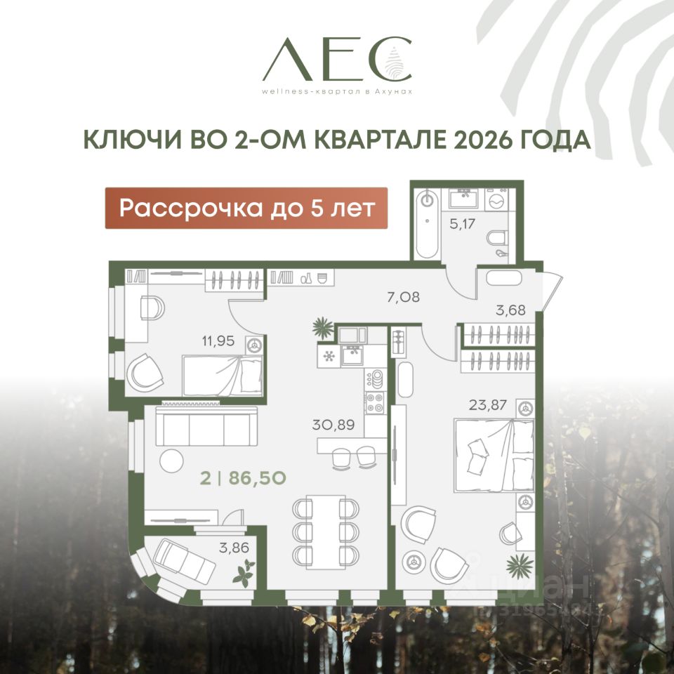 ЛЕС wellness-квартал в экологически чистом районе Ахуны Сдача первой очереди летом 2026 года! Квартиру можно посмотреть уже сейчас Большой выбор условий оплаты от DEWELL group: - Ипотека от 4,6% без удорожания - Рассрочка до конца строительства 0% - Рассрочка до 5 лет, без участия банка - Рассрочка в первоначальным взносом 1 000 000 рублей - TRADE IN от застройщика Преимущества wellness-квартала ЛЕС: Собственный лесной парк, где под тенью сосен расположилось множество зон для отдыха и развлечений: - Зоны для занятий йогой - Беседки для пикника - Детское пространство с горками, батутами и качелями - Универсальная спортивная площадка летом, которая зимой превращается в каток Дворовое пространство: - Детские велодорожки на территории двора - Навесы с ширмами для отдыха - Детское пространство с площадкой для игры с водой, большая песочница с навесом - Гамаки и лежаки для тихого отдыха -Спортивные зоны с теннисными столами *Огороженная и охраняемая территория двора без машин Авторские холлы с зоной ожидания, санузлами, колясочными и велосипедными Квартиры с видом на лес: - Просторные кухни-гостиные - Мастер-спальня - Закрытые лоджии - Летние лоджии - Уникальные лоты с потолками 3,3м Расположение: -Ввело-лыже-роллерная трасса-1 мин пешком -Школа 19/Детский сад 23- 5 мин на машине -Открытый бассейн-6 мин на машине -Теннисный корт ''Семейный''-6 мин на машине -Русская охота-8 мин на машине -Высшая лига-15 мин на машине *Стоимость актуальна на момент размещения объявления