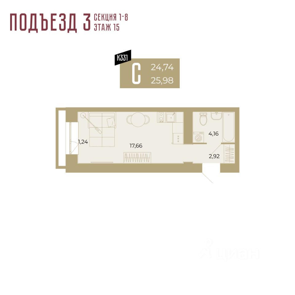24 м² · Этаж 15 из 15