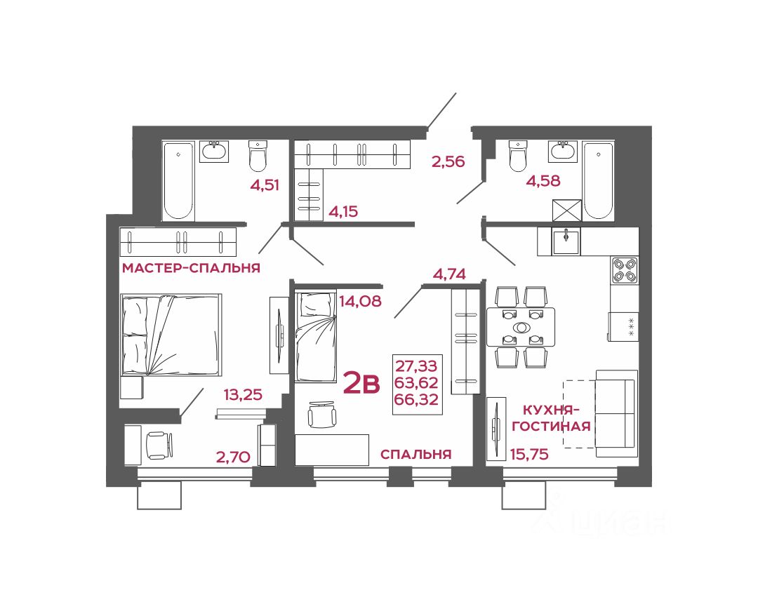 66 м² · Этаж 19 из 22