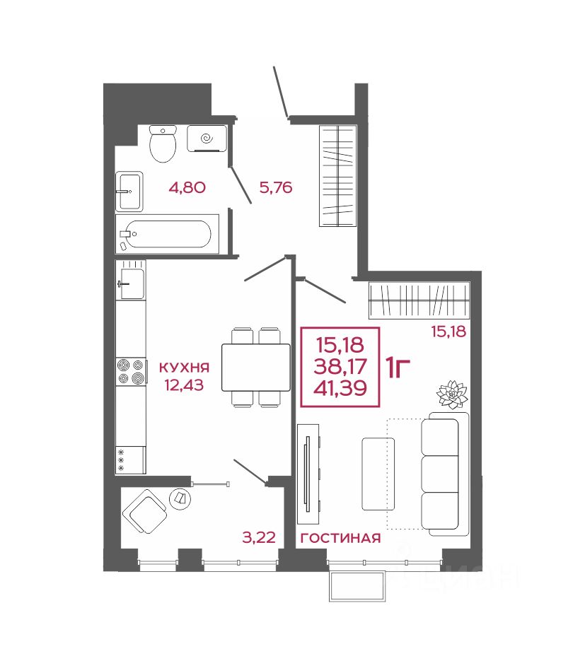 38 м² · Этаж 15 из 17