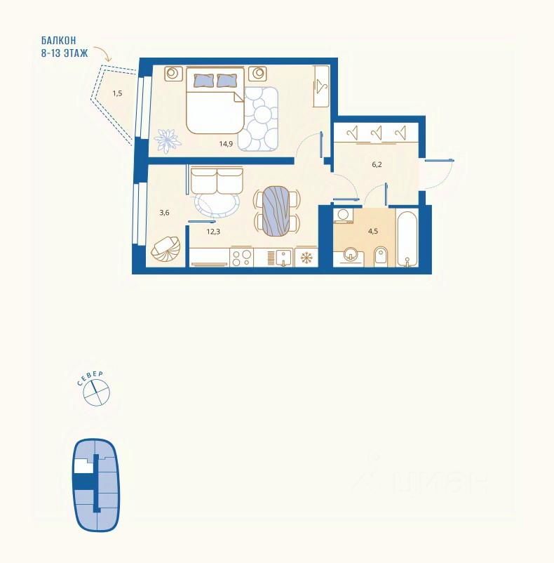 43 м² · Этаж 9 из 16