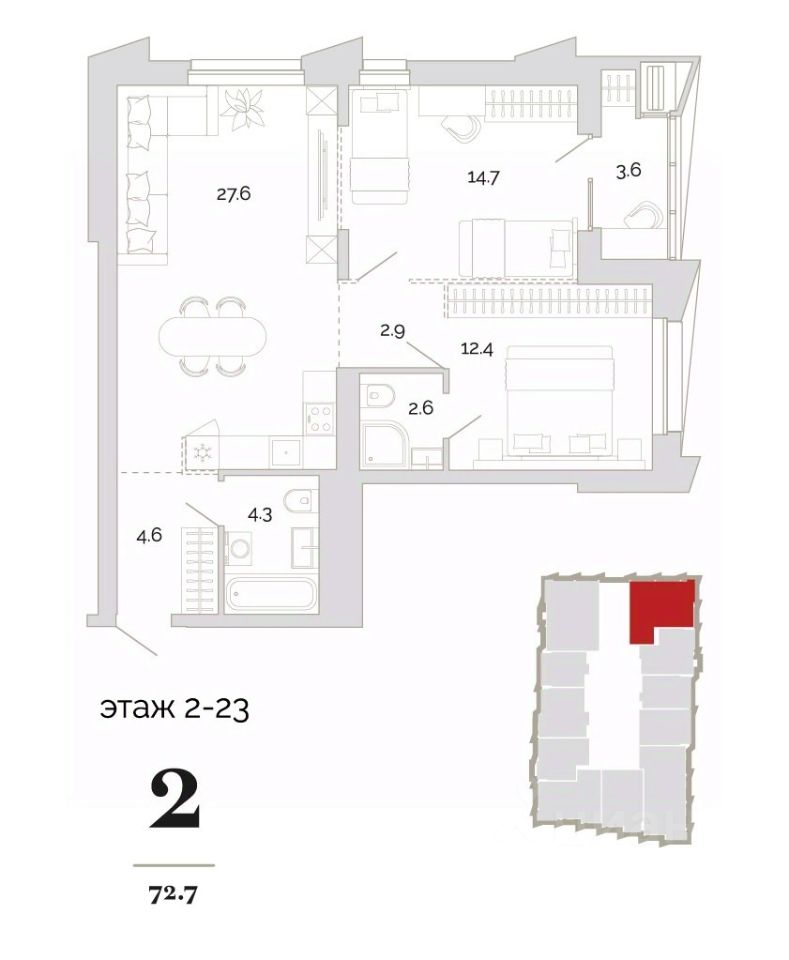 - 2 башни в 19 и 24 этажа, - Торговая линия на 1 этаже, - Панорамное угловое остекление лоджий, - Террасы на высоких этажах с панорамными видами, - Галерея закатов на 24 этаже, - Зеленая зона для отдыха на 2 этаже, - Благоустроенный двор с многофункциональным зонированием, - 110 кладовых помещений, - Подземный паркинг на 189 машино-мест, - Большой выбор планировочных решений, - Закрытый двор и собственная система безопасности.