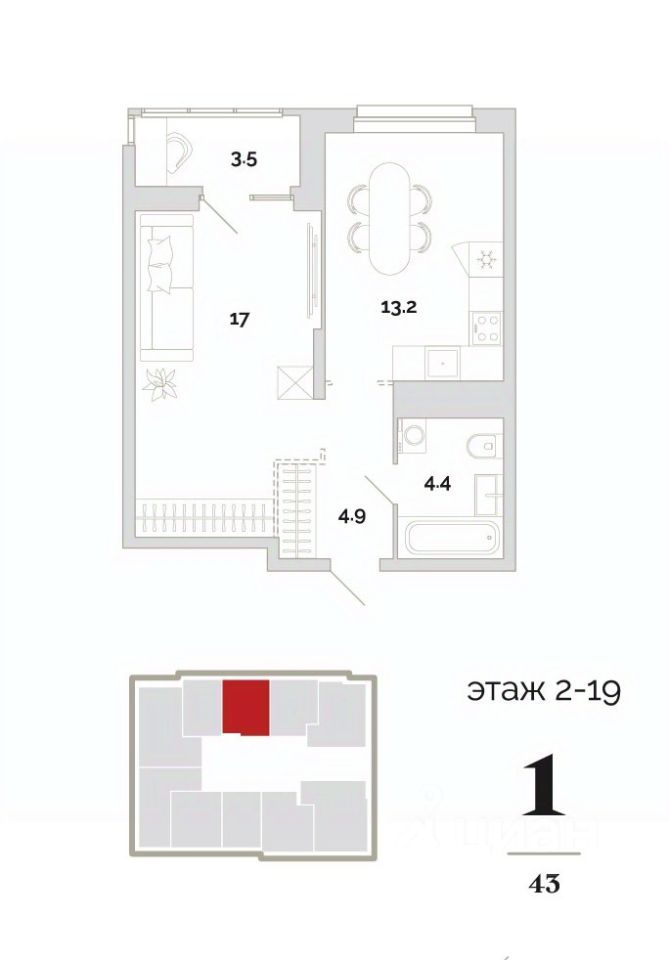 Общая площадь43 м2