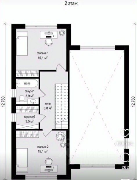 Второй этаж: две спальни по 15,1 кв.м, просторный холл 6,8 кв.м, санузел 3,5 кв.м, гардеробная.
