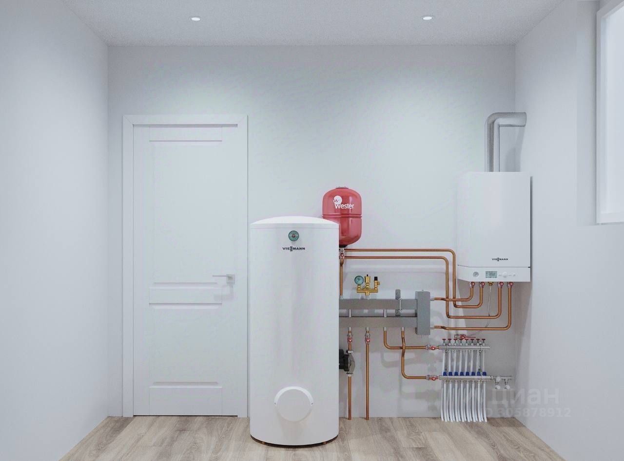 Первый этаж - водяной теплый пол от отопления,полусухая стяжка пола, стены отштукатурены. Сделана шумо-теплоизоляция между первым и вторым этажами. Высота потолка в кухне-гостинной 5,8 м со вторым светом. В доме все коммуникации и электричество: тепло, газ и вода разведены по всему дому, установлены биметаллические радиаторы отопления .Септик.
