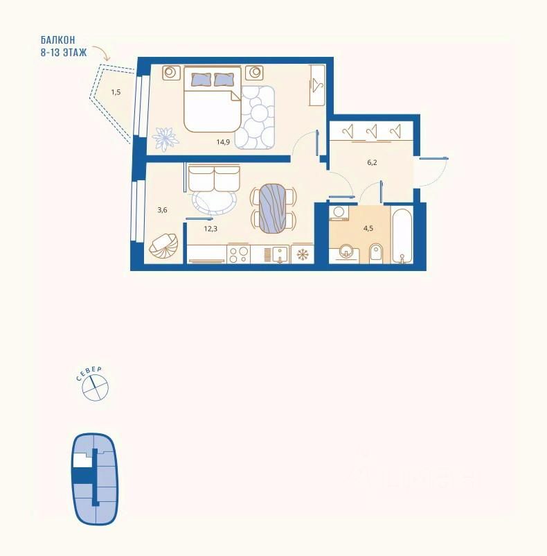 Жилая площадь14,9 м2
