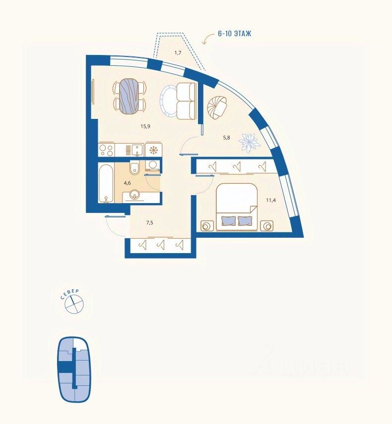 Жилая площадь11,4 м2
