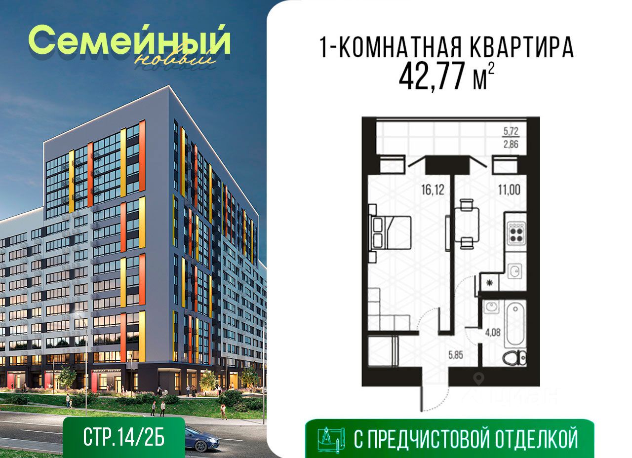 Варианты отделки квартир: •Предчистовая •Базовая •''Комфорт'' •''Комфорт+'' с кухней и техникой Специальные условия: •Семейная ипотека — ставка от 4,6% на весь срок •Дополнительные скидки для всех покупателей — до 500 000 ?