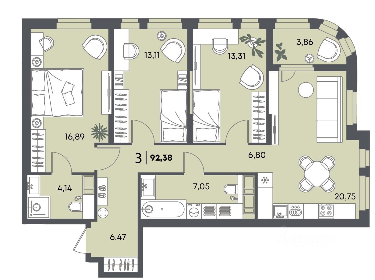 Общая площадь92,38 м2