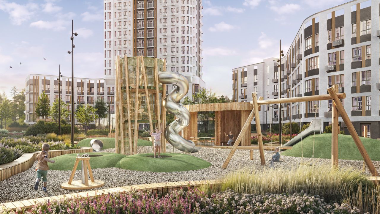 Собственный лесной парк, где под тенью сосен расположилось множество зон для отдыха и развлечений: - Зоны для занятий йогой - Беседки для пикника - Детское пространство с горками, батутами и качелями - Универсальная спортивная площадка летом, которая зимой превращается в каток