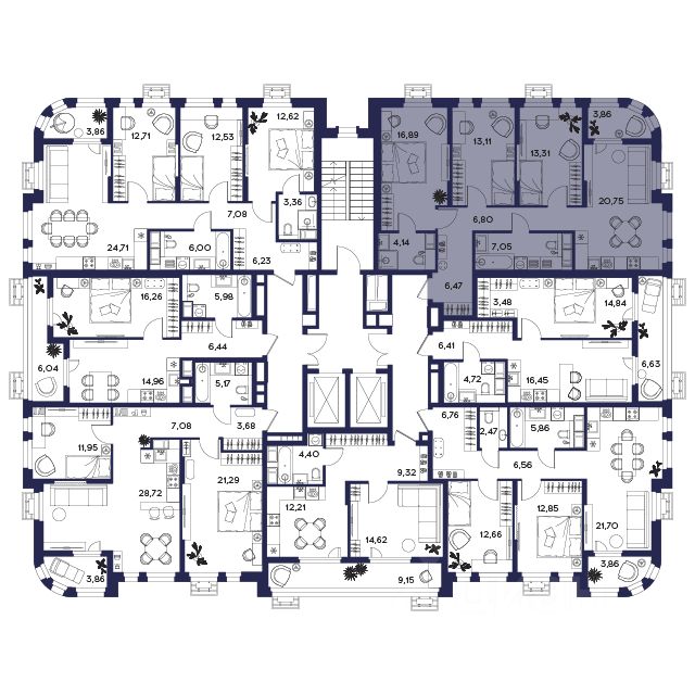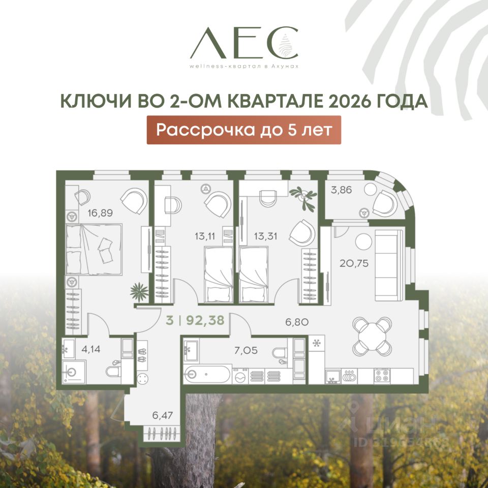 Квартиры с видом на лес: - Просторные кухни-гостиные - Мастер-спальня - Закрытые лоджии - Летние лоджии - Уникальные лоты с потолками 3,3м