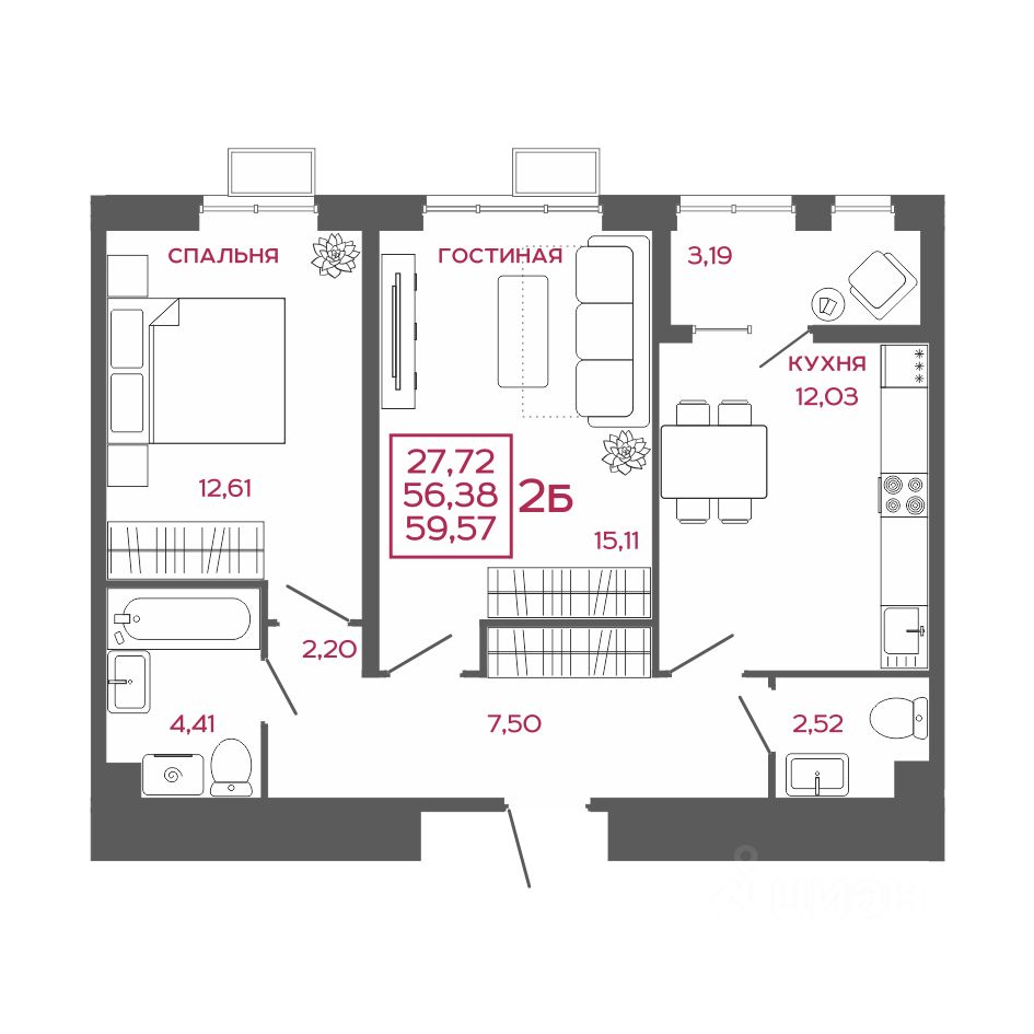 Общая площадь59,57 м2