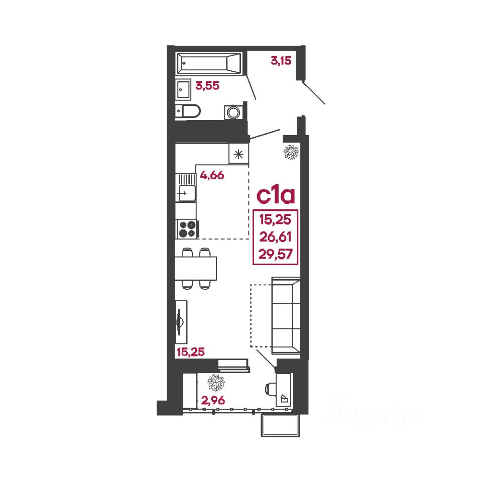 Общая площадь29,57 м2