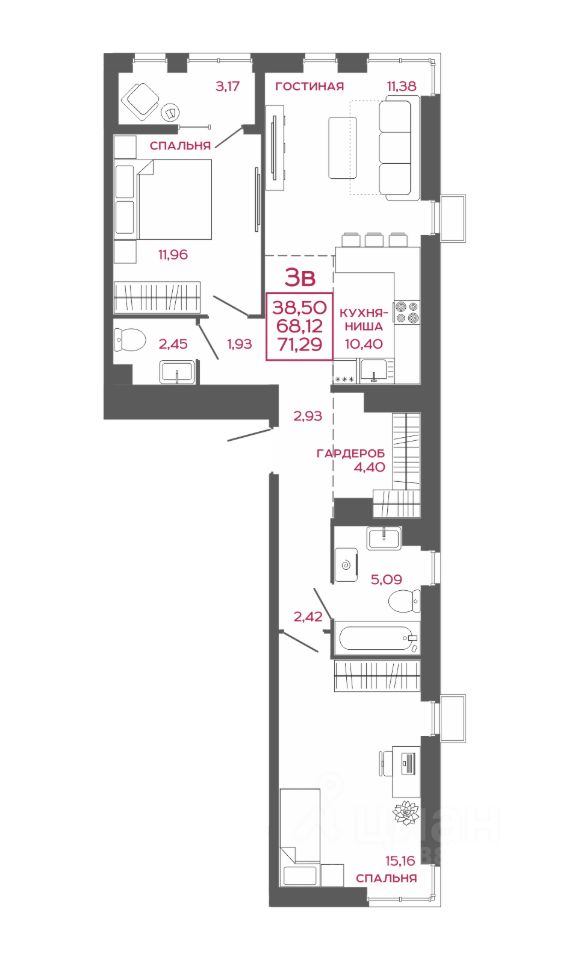Общая площадь71,29 м2