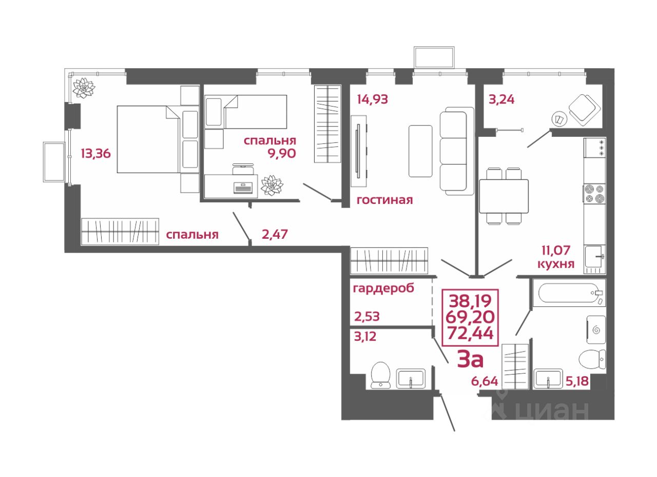 Общая площадь72,44 м2