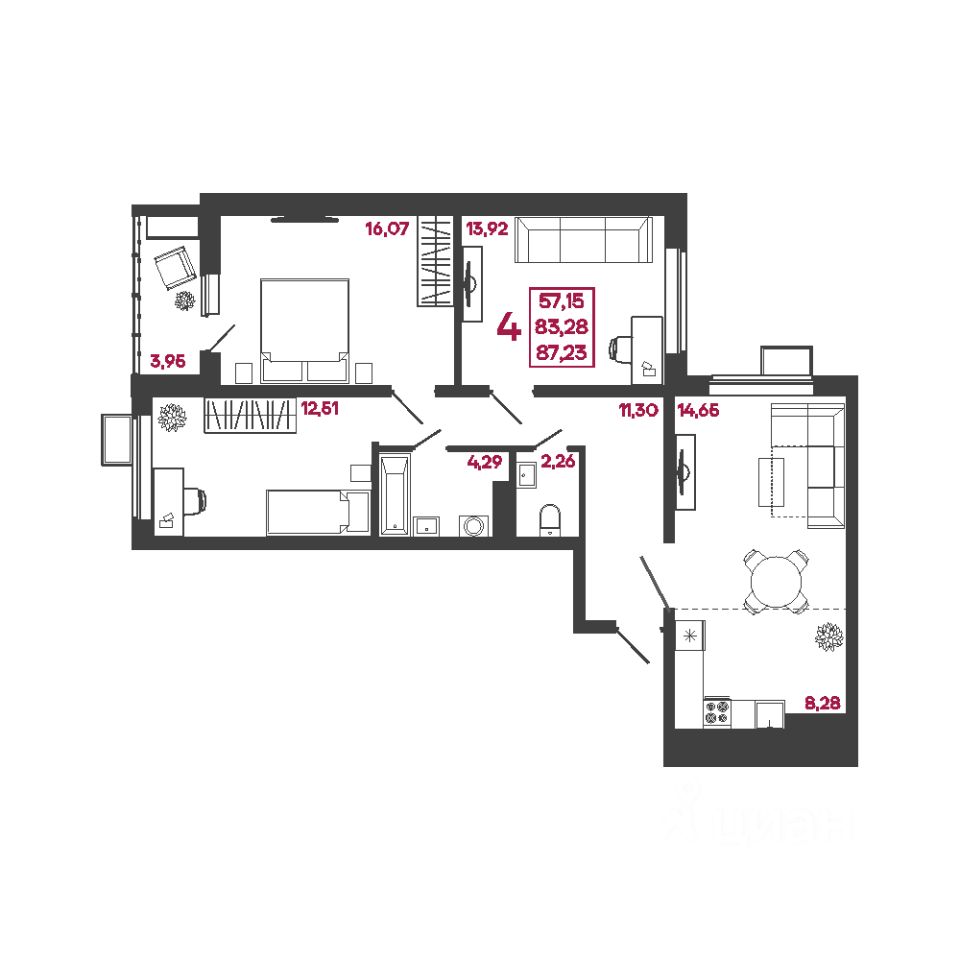 Жилая площадь57,2 м2