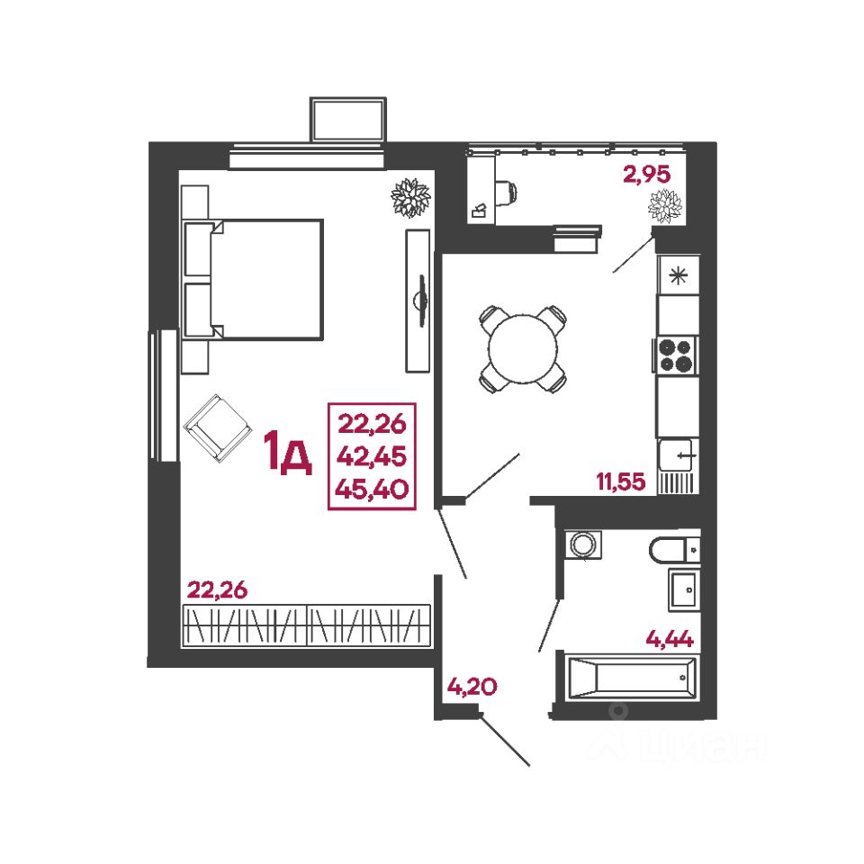 Общая площадь45,4 м2