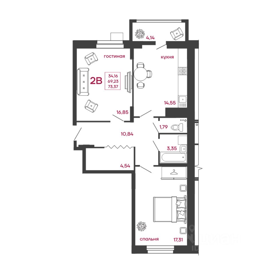 Общая площадь73,37 м2