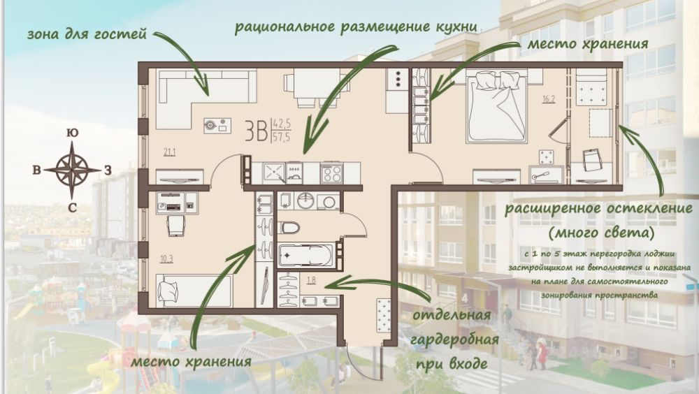 Общая площадь квартиры 57.5 кв. м (с учетом панорамной лоджии площадью 3.4 кв. м.)