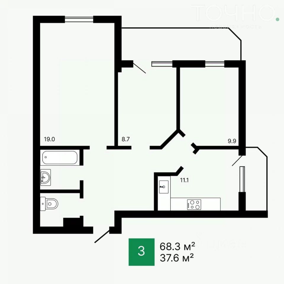 Общая площадь: 68,3 кв.м. + 2 лоджии 11,9 кв.м