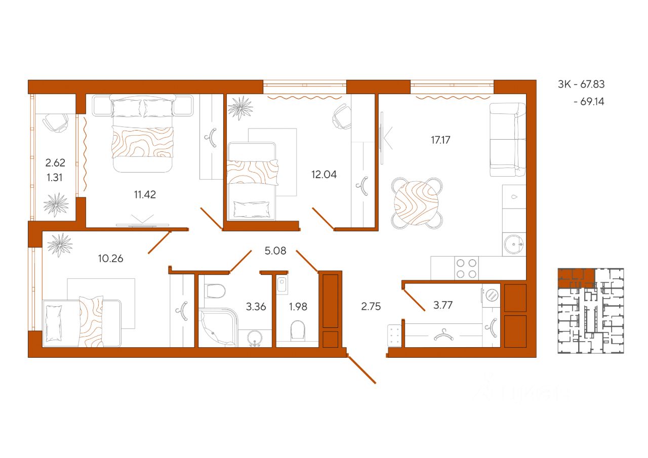 Общая площадь69,14 м2