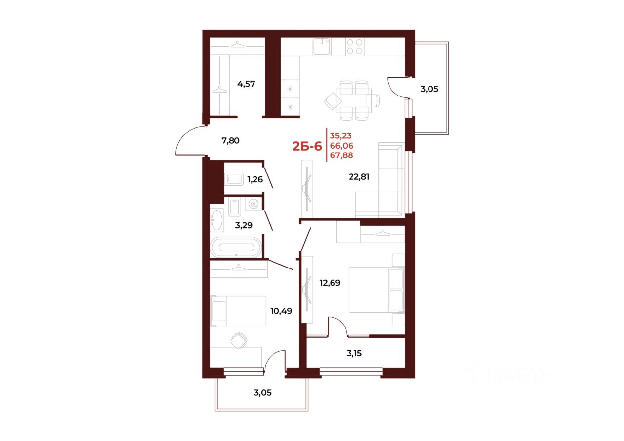 Общая площадь67,88 м2
