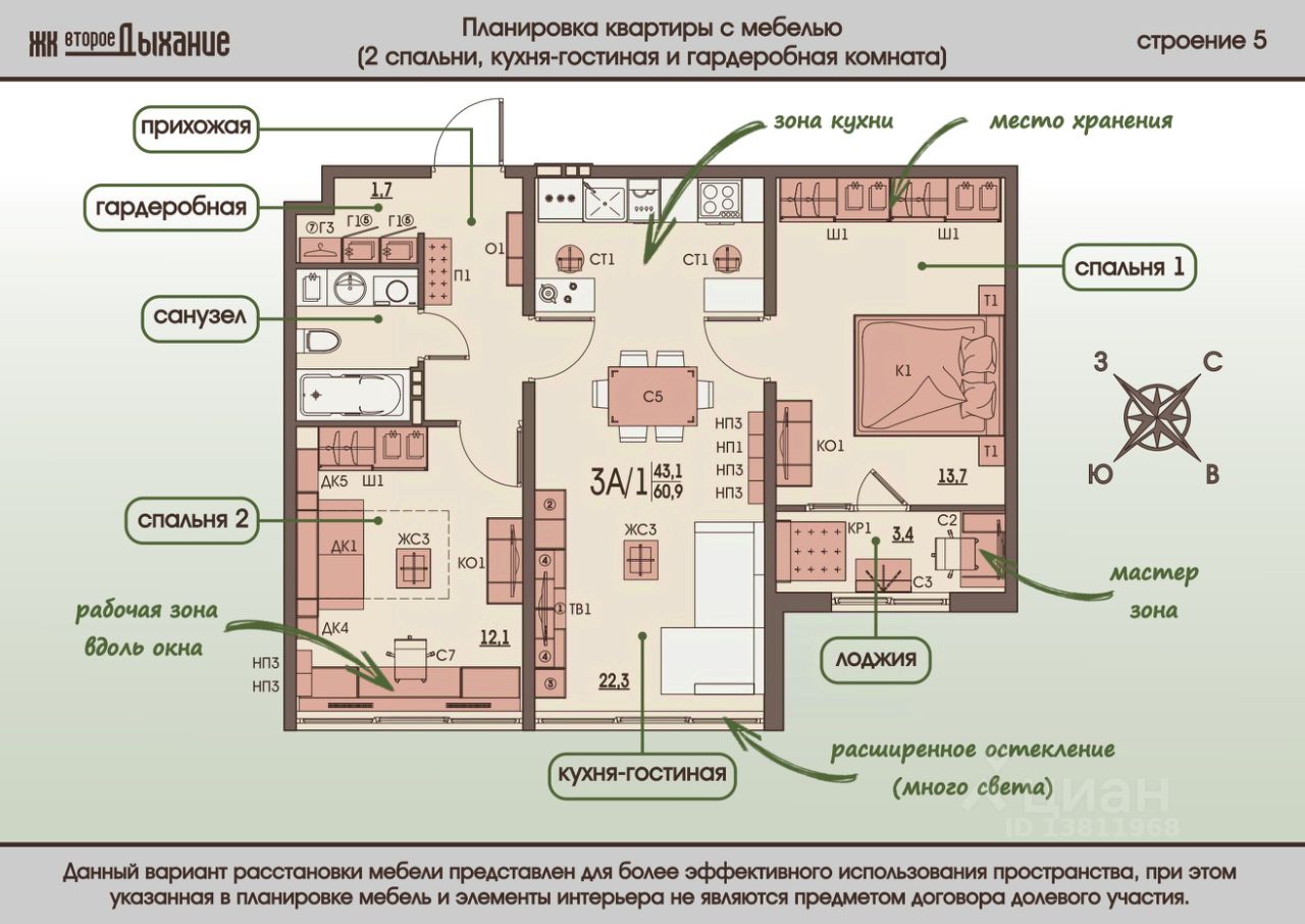 Один из самых популярных вариантов современной недвижимости - это вариант квартиры с просторной кухней-гостиной 22,3 кв.м. и двумя отдельными комнатами 13,7 и 12,1 кв.м. , которые удалены друг от друга. Такой вариант жилья очень удобен. У родителей и детей есть своя собственная личная территория, и в то же время присутствует место для общего проведения досуга.