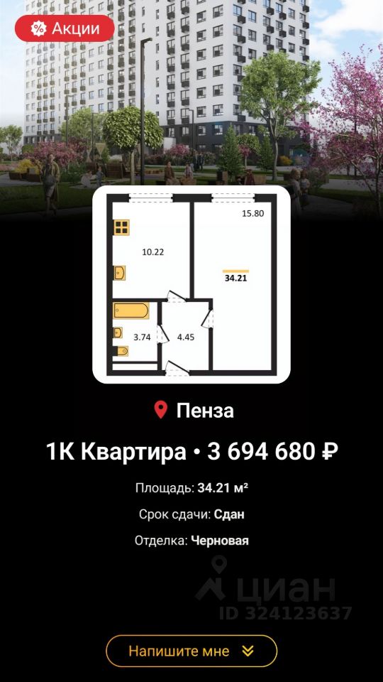 Площадь квартиры: 34/15.8/10.9 кв.м.