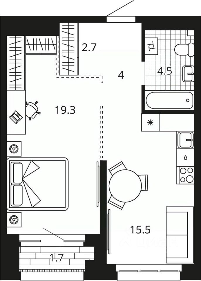 Жилая площадь19,3 м2