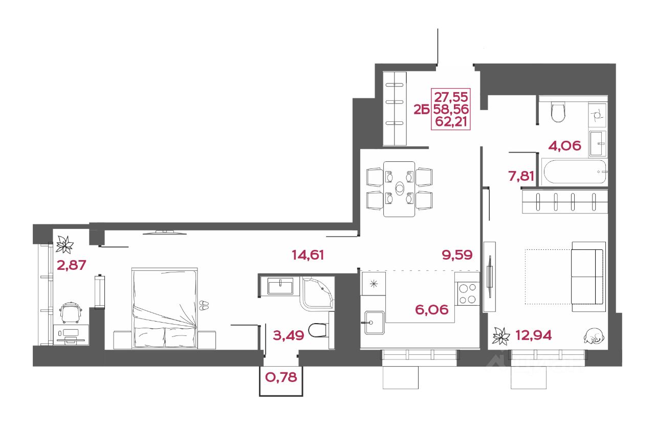 Общая площадь62,21 м2