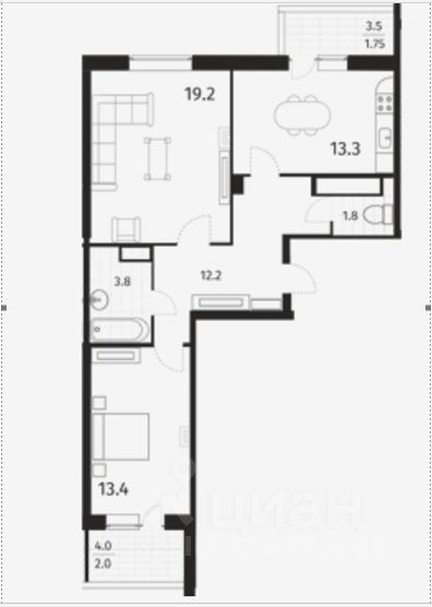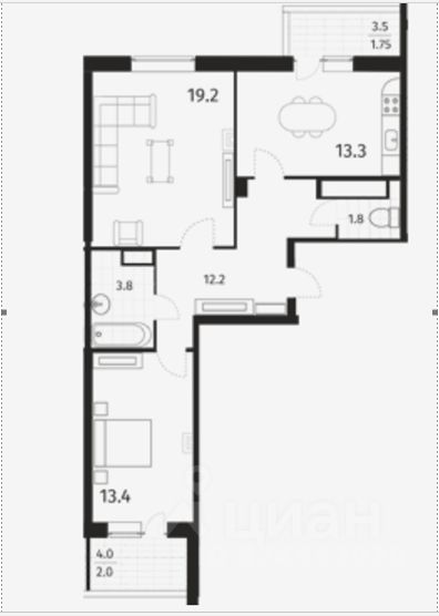 Общая площадь 71,2 м2 Жилая 32,6 м2 Просторная кухня 13,3 м2