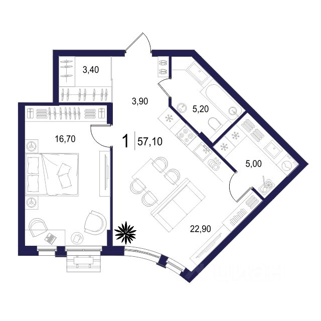 Общая площадь57,1 м2