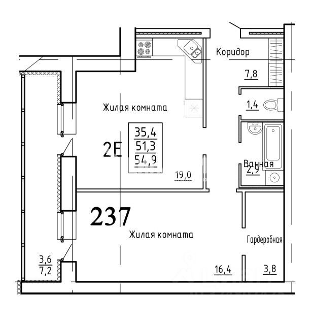 Общая площадь - 51,5 м2 (по документам)