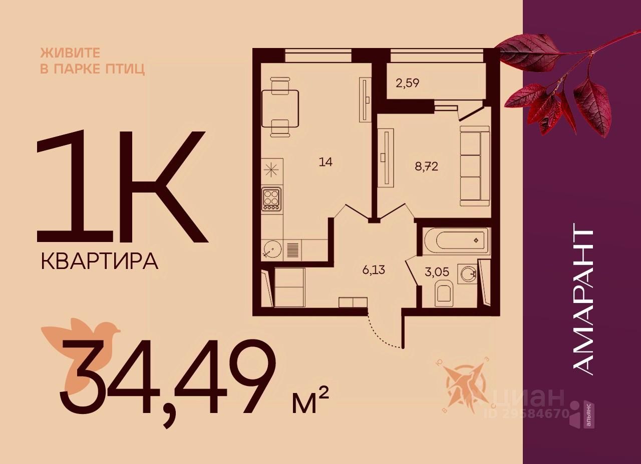 Общая площадь34,49 м2