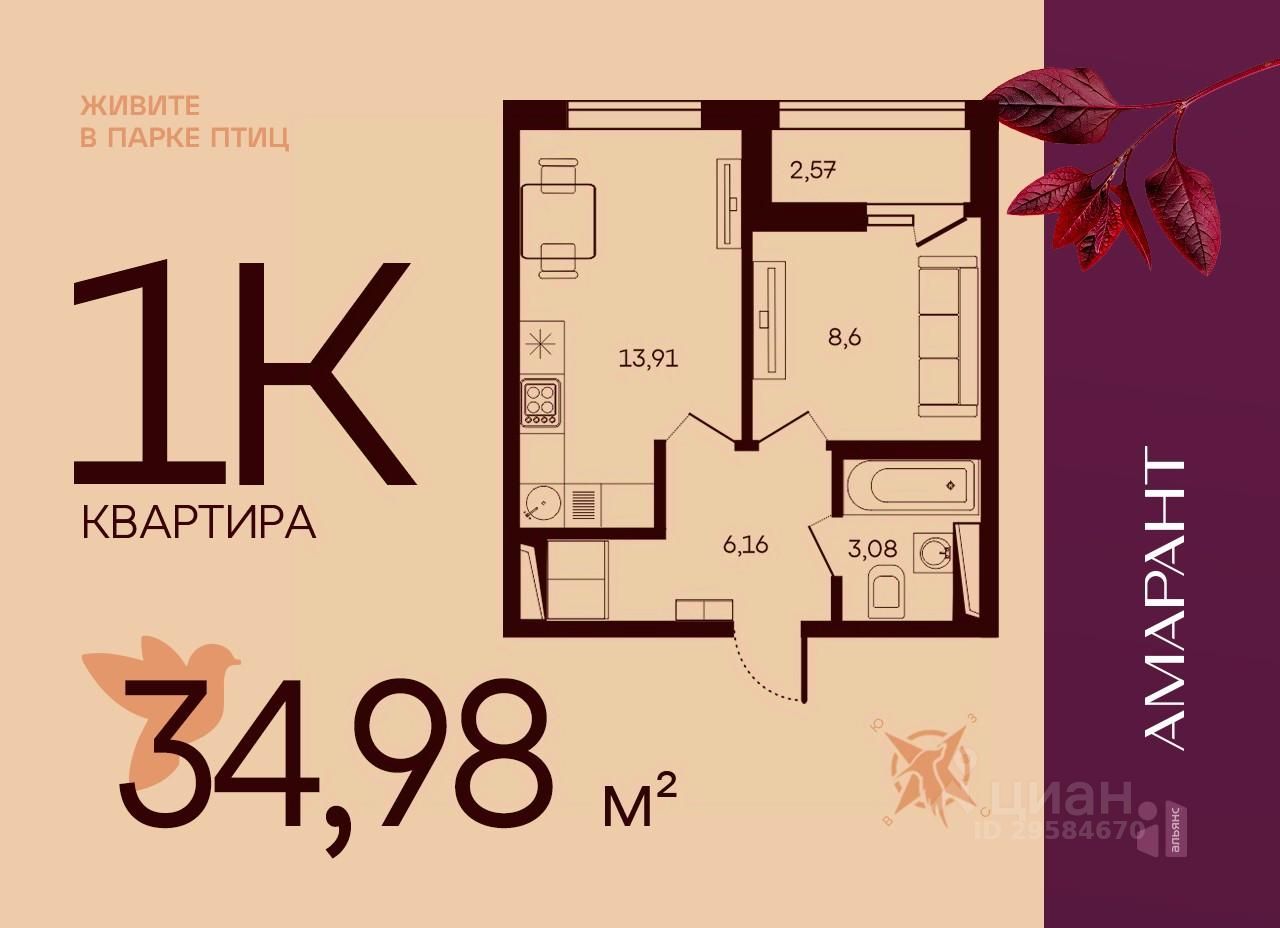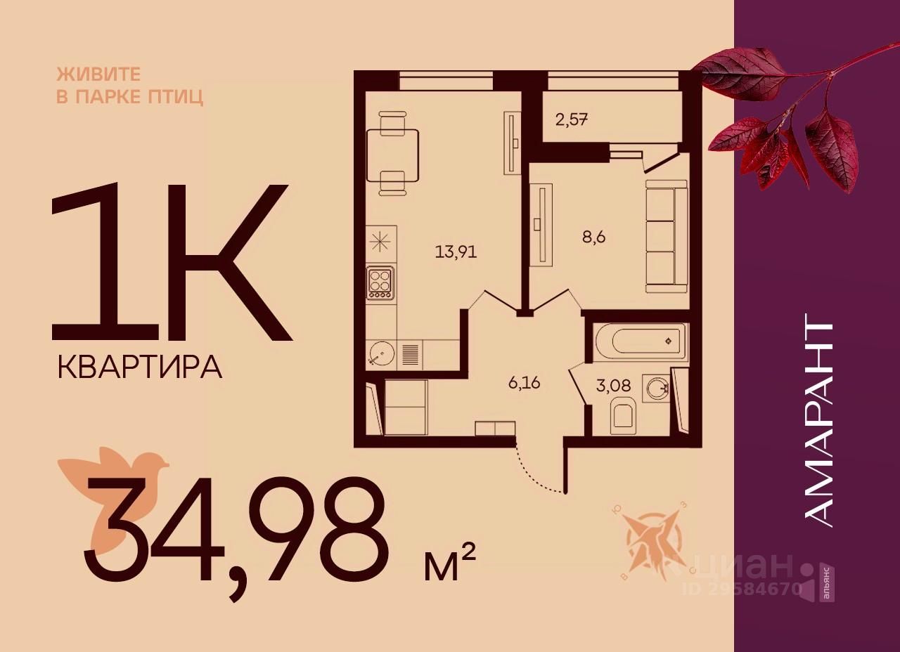 Общая площадь34,98 м2