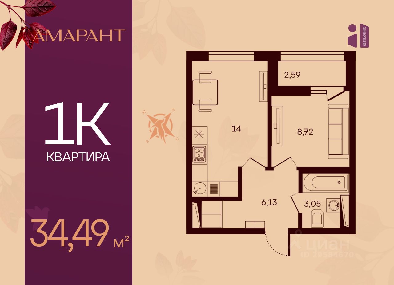 Общая площадь34,49 м2
