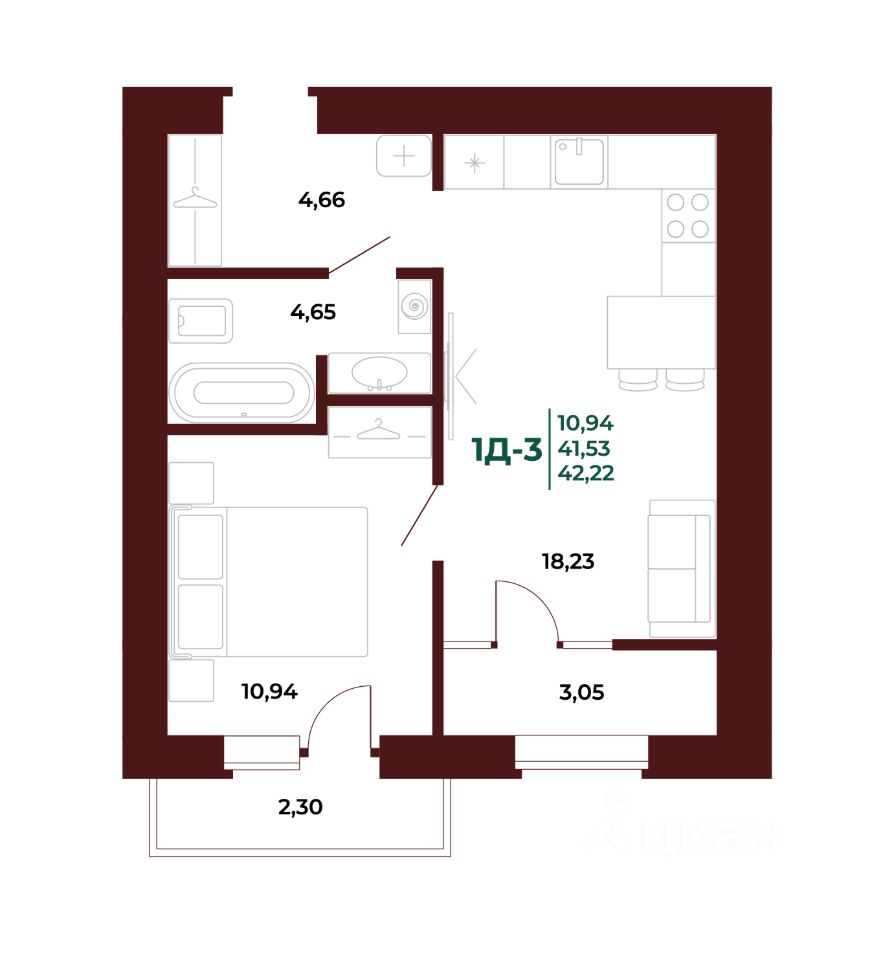 Общая площадь43,45 м2