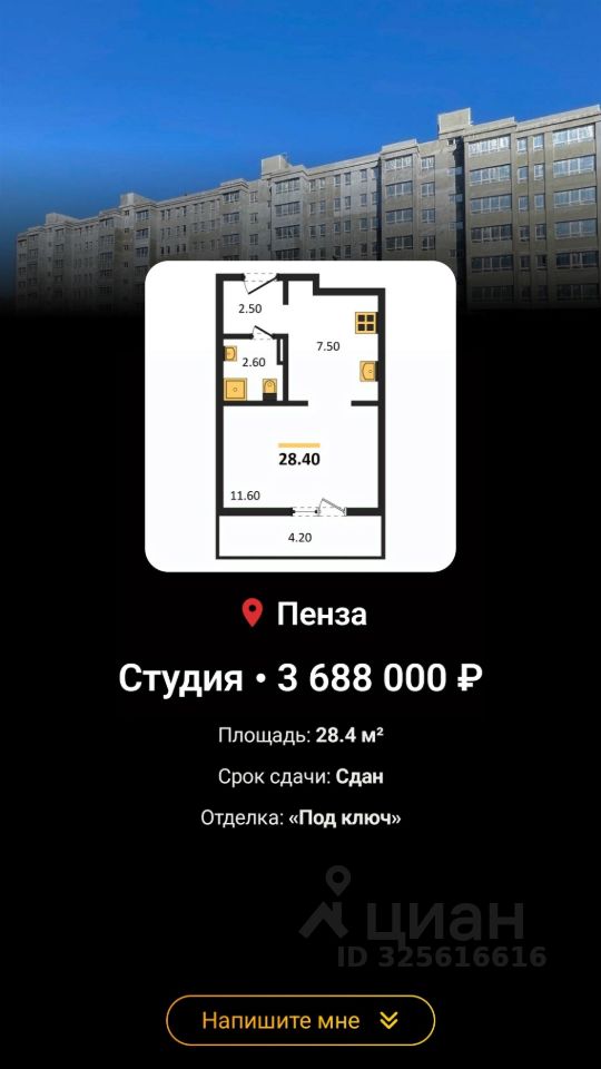 Продается уютная студия в новом доме в селе Засечное, Пензенский район. Квартира расположена на 3-м этаже 9-этажного монолитного дома, построенного в 2025 году.Дом сдан выдача ключей декабрь 2026 года. Общая площадь квартиры составляет 28.4 кв. м, а кухня занимает 7.5 кв. м. Высокие потолки 2.7 метра и окна, выходящие во двор и на улицу, делают помещение светлым и просторным.