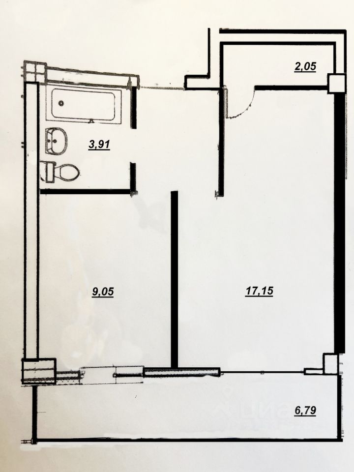 Общая площадь 42 м2 (с учетом балкона) Жилая 17,15 м2 Кухня 9,05 м2 Большой балкон на всю квартиру 6,8 м2