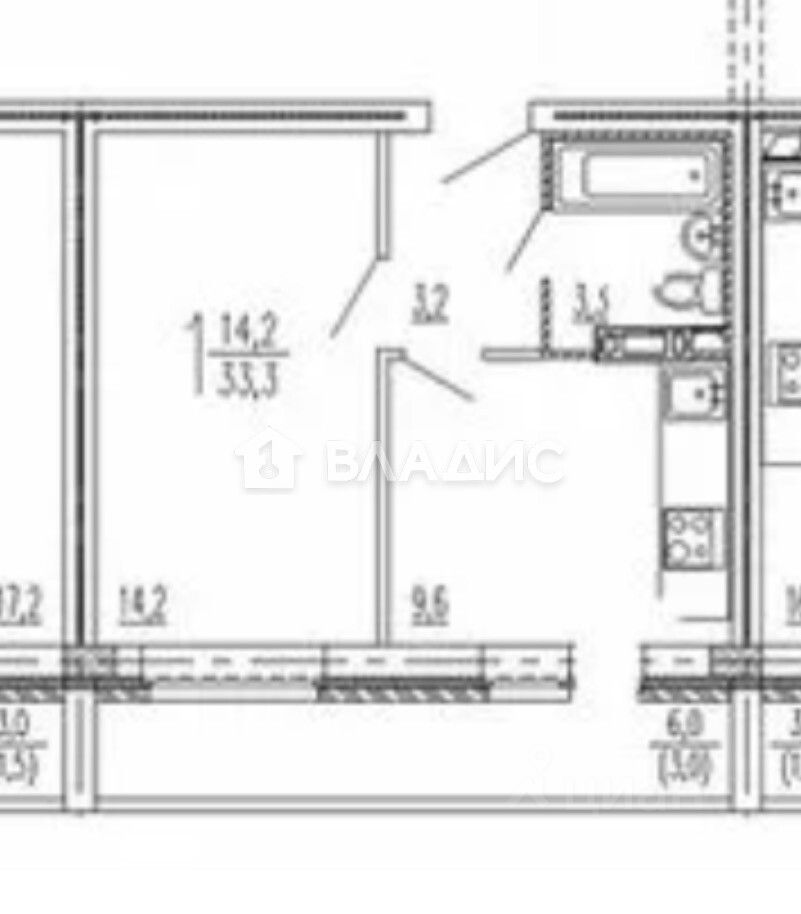 Общая площадь квартиры составляет 38,1 кв. м, из которых 15,6 кв. м — жилая площадь, а 9,7 кв. м — кухня.