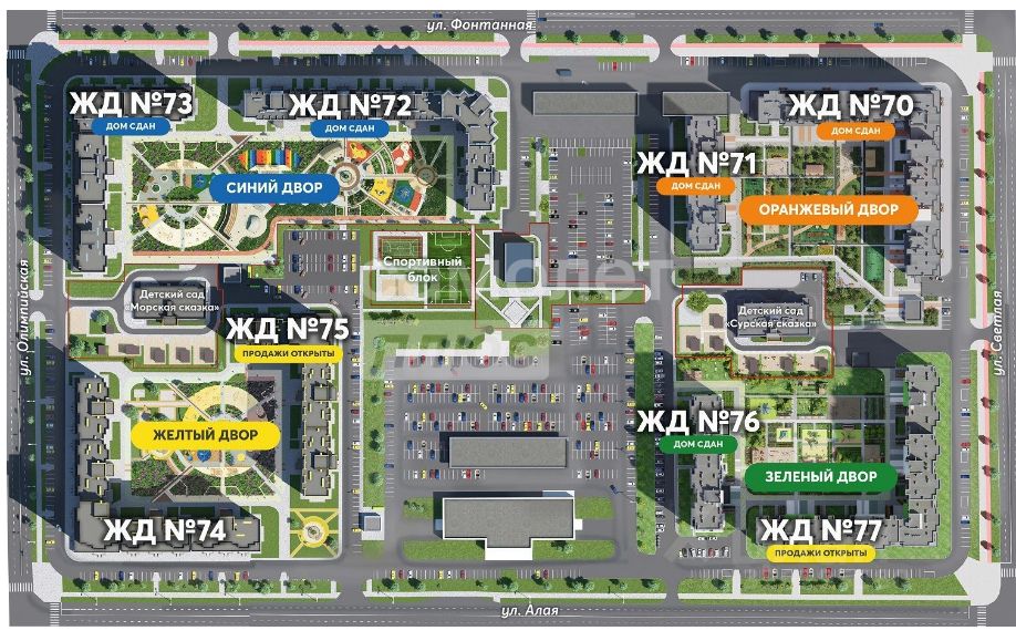 Инфраструктура: Рядом с ЖК живописное озеро, благоустроенная набережная со светомузыкальным фонтаном, спортивная тропа здоровья, пляж и все необходимые объекты социальной инфраструктуры: детсады и школа, бассейн и спортивно-развлекательный центр, поликлиника и почта, кафе и магазины. Закрытая территория - ''Двор без машин''.