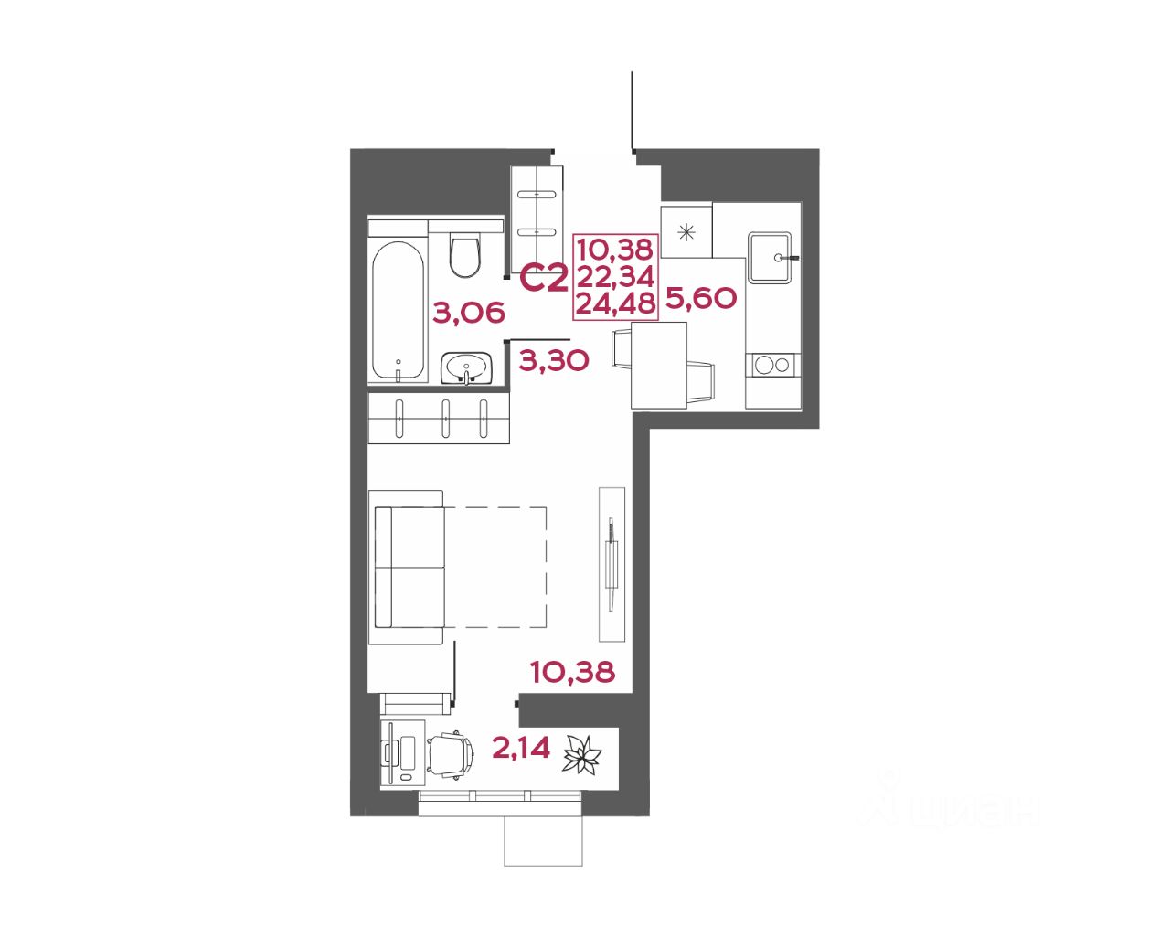 Общая площадь24,48 м2
