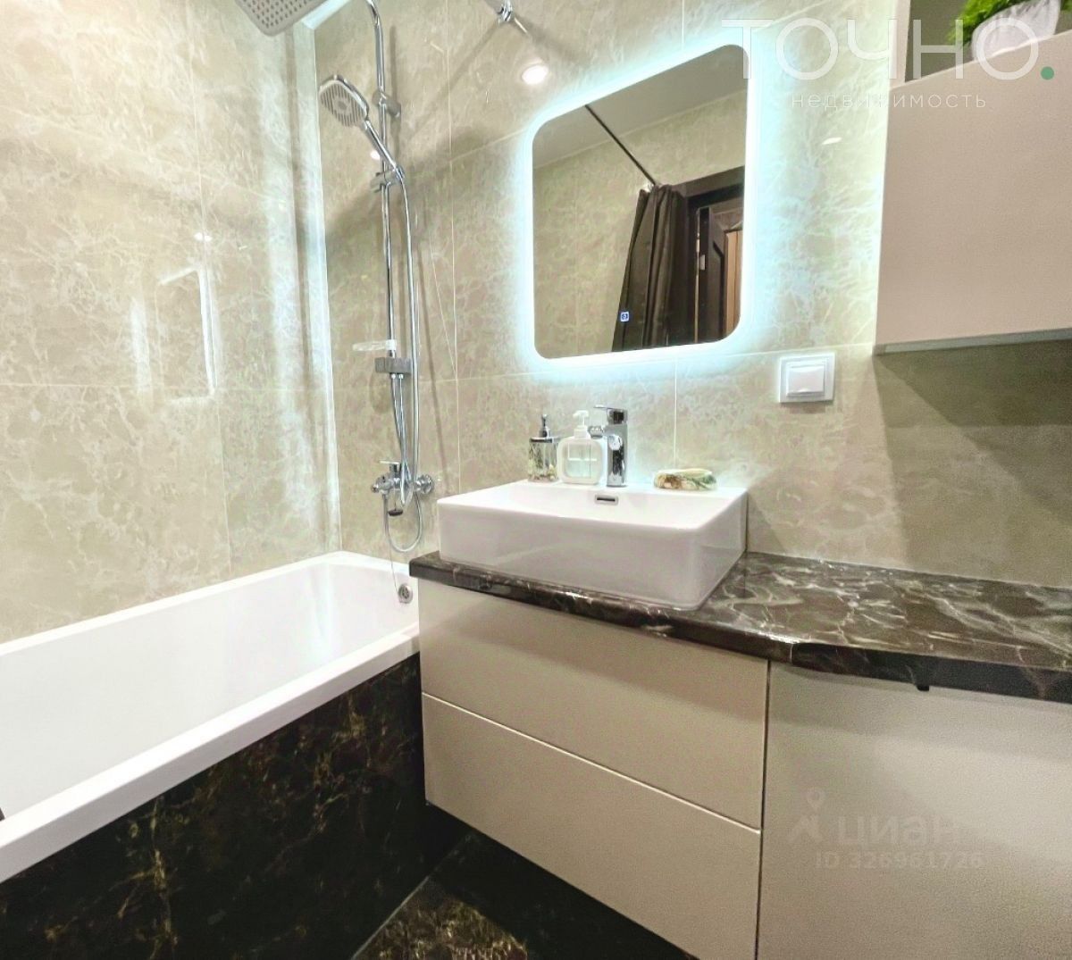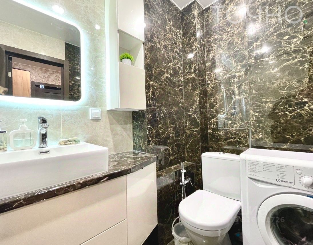 Санузел совмещенный в современном кафеле, с фирменной сантехникой.
