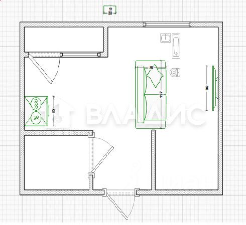 Общая площадь - 28,1 кв.м. Жилая площадь- 16 кв.м. Кухня- 8 кв.м.