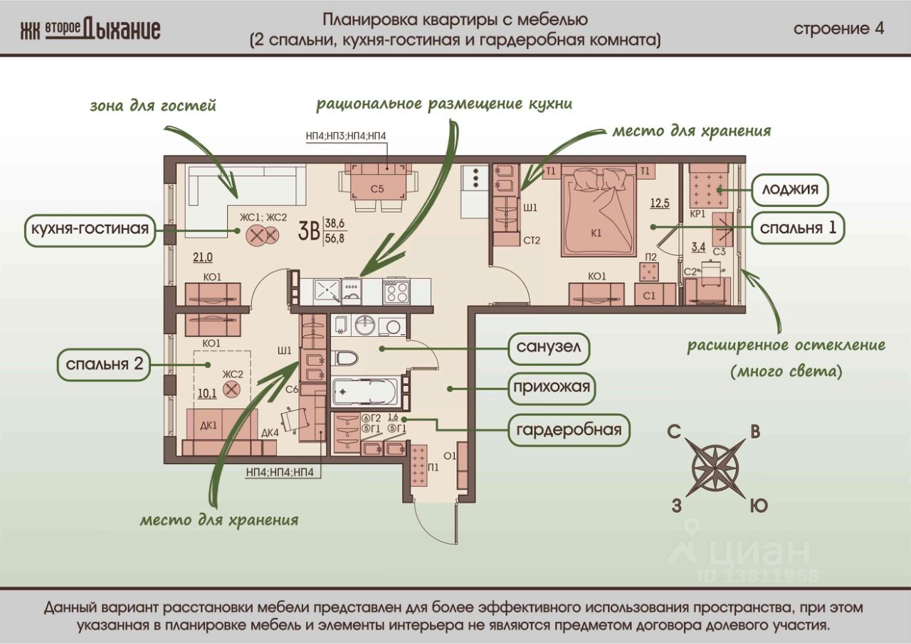Евротрехкомнатная Квартира - ''распашонка'' 56,8м2. Современная планировка евро-формата, которая позволит воплотить Ваши мечты и сделать квартиру уникальной! Сердцем данной квартиры является просторная кухня гостиная 21 кв.м. и располагает к тому, чтобы вся семья собиралась по вечерам в одном месте. Изолированными остаются только спальни. Это отличное решение для семей с детьми. Если разместить игровую зону в гостиной, можно следить за ребенком, не выходя за пределы кухни. А если дети уже взрослые, большим плюсом является удалённость родительской комнаты от детской. Отдельная гардеробная комната расположенная при входе это рациональный способ решить вопрос компактного размещения вещей.