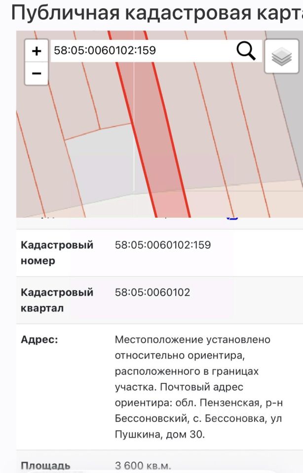 Продается участок площадью 36 соток в с. Бессоновка (кадастровый номер указан на фото).