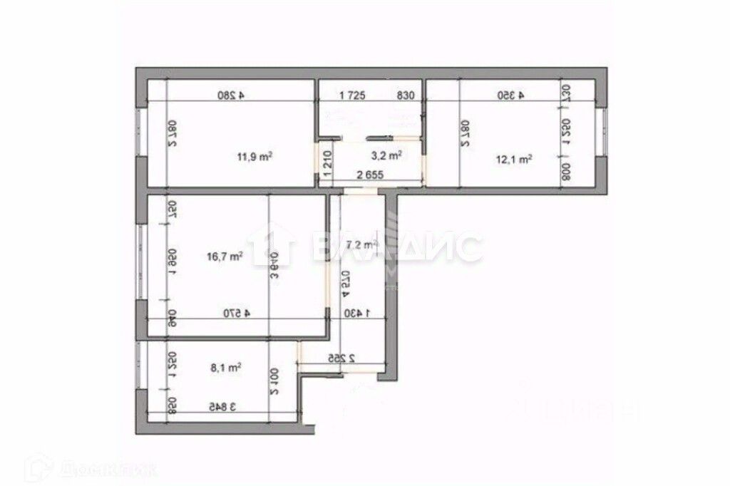 Общая площадь 82 кв. м, из которых 45 кв. м — жилая площадь. Три комнаты имеют площадь 20, 15 и 10 кв. м соответственно, кухня — 9 кв. м. лоджия — 7 кв. м.